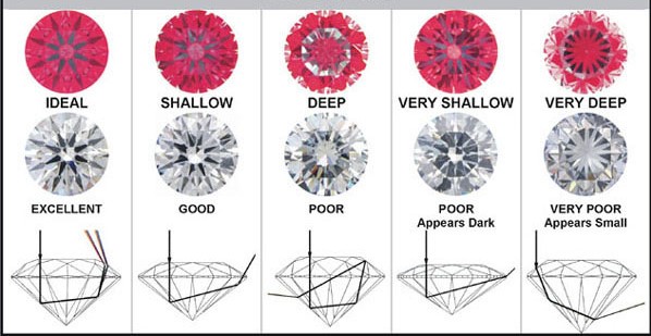ในรูปจะเห็นได้ชัดว่าเพชรที่ผ่านการเจียระไนมาได้อย่างดีเยี่ยมนั้นจะทำให้แสงสะท้อนกลับขึ้นไปตรงด้านหน้าของเพชรซึ่งจะทำให้เป็นประกายสวยงาม แต่ถ้าเจียระไนมาได้ไม่ดีก็จะทำให้แสงทะลุออกไปด้านข้าง หรือ ด้านล่างของเพชรจึงทำให้ความแวววาวและระยิบระยับของเพชรลดลง